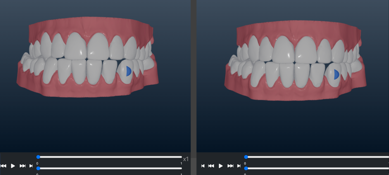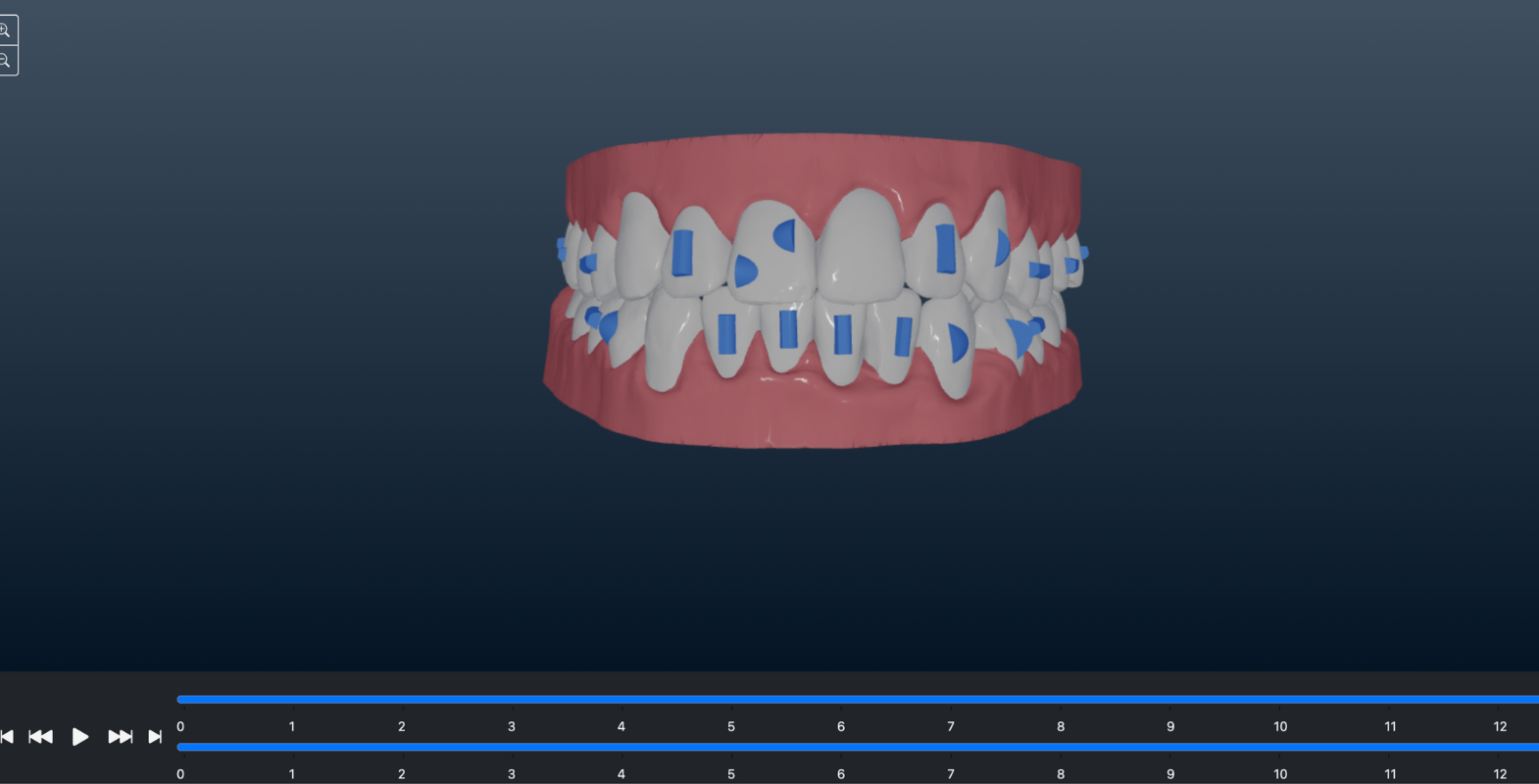 Orthovue offers the ability to identify the number of aligners, showcasing stage-by-stage only predictable movements, IPR needed, required features necessary to achieve the final position, a grid for measuring distances and planes, as well as initial and final position shading for visual judgment.